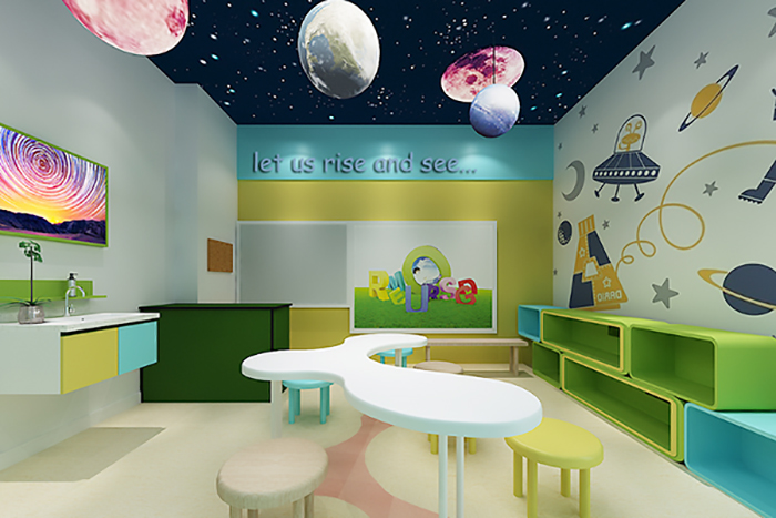 少兒英語(yǔ)培訓(xùn)學(xué)校一般會(huì)根據(jù)年齡的不同劃分為若干個(gè)班級(jí),設(shè)計(jì)師要根據(jù)空間面積合理劃分。設(shè)計(jì)師在設(shè)計(jì)的時(shí)候要盡可能的將學(xué)習(xí)區(qū)域與玩耍區(qū)域劃分開,保證孩子們有足夠的寬敞的活動(dòng)空間。對(duì)于角落空間可以制作儲(chǔ)物柜或者小擱架,不僅可以擴(kuò)大室內(nèi)空間,而且還可以形成美觀、流暢及統(tǒng)一的視覺(jué)效果。