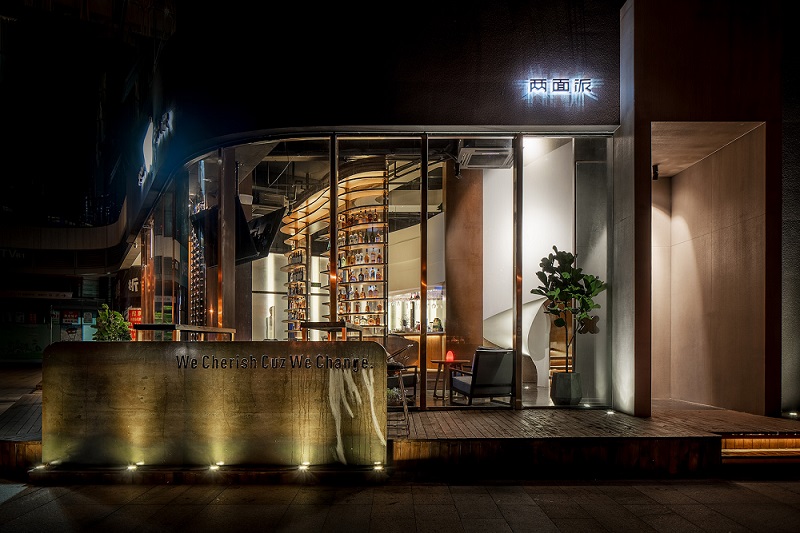 由于面積局限,將落體玻璃設(shè)計成高5米的戶型酒架,不但界定出來酒吧的前后場地區(qū)域,還充當儲物展示作用,最大限度地提升空間使用率,穿孔不銹鋼鏡面提高了空間通透感。在這里,你可以盡情的釋放自我,打開內(nèi)心的藩籬、摘掉日常的面具,“移步換景”后,興許你還能碰到另一個久違的自己。