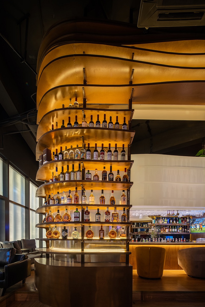 設(shè)計技巧:運用豐富的視覺感官創(chuàng)造動靜相宜的酒吧空間,以吧臺為核心和原點,刻意抬高的組合設(shè)計將空間分割成不同的功能區(qū)域。利用原建筑層高的優(yōu)勢,通過具有雕塑感的雙螺旋